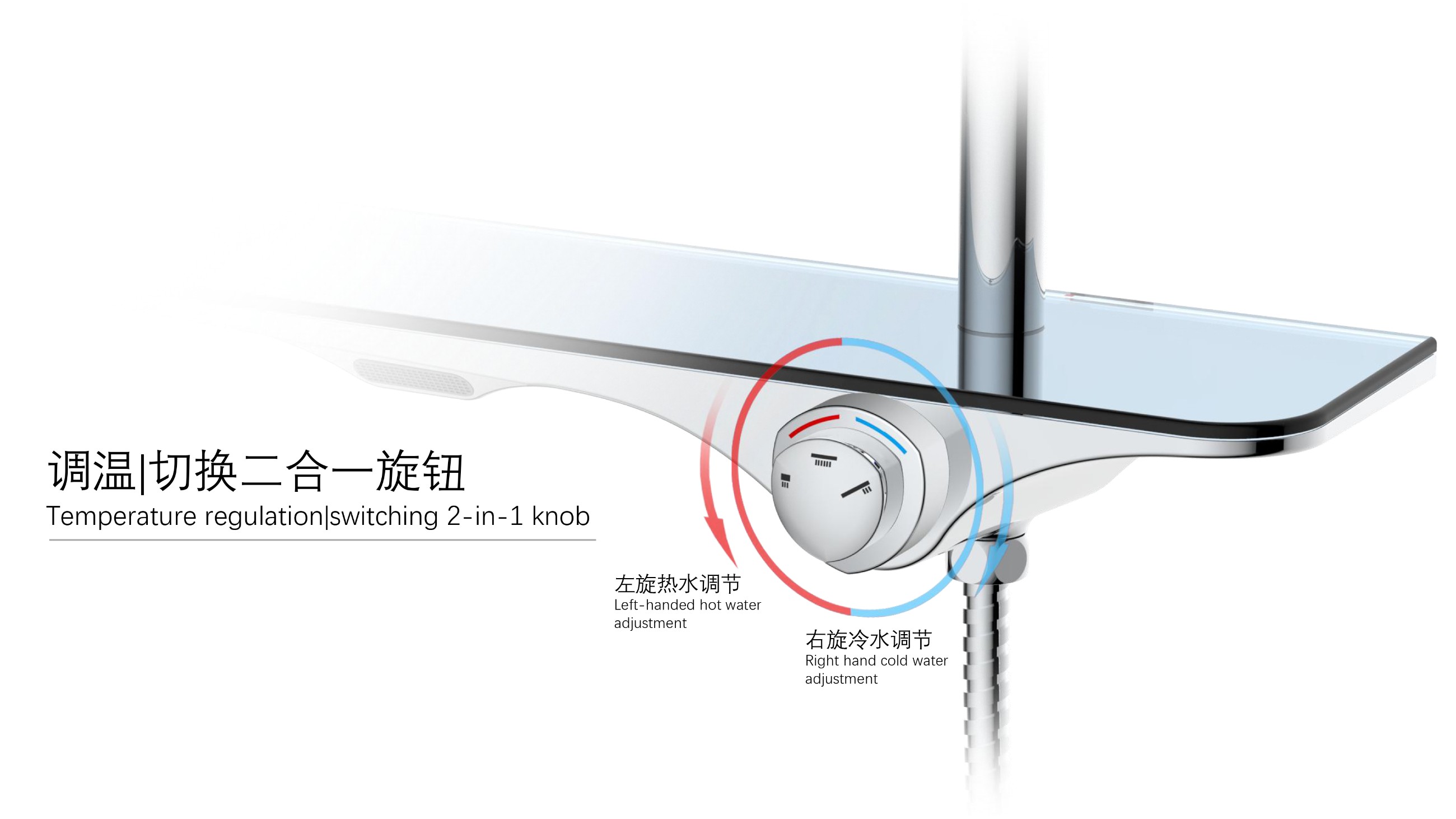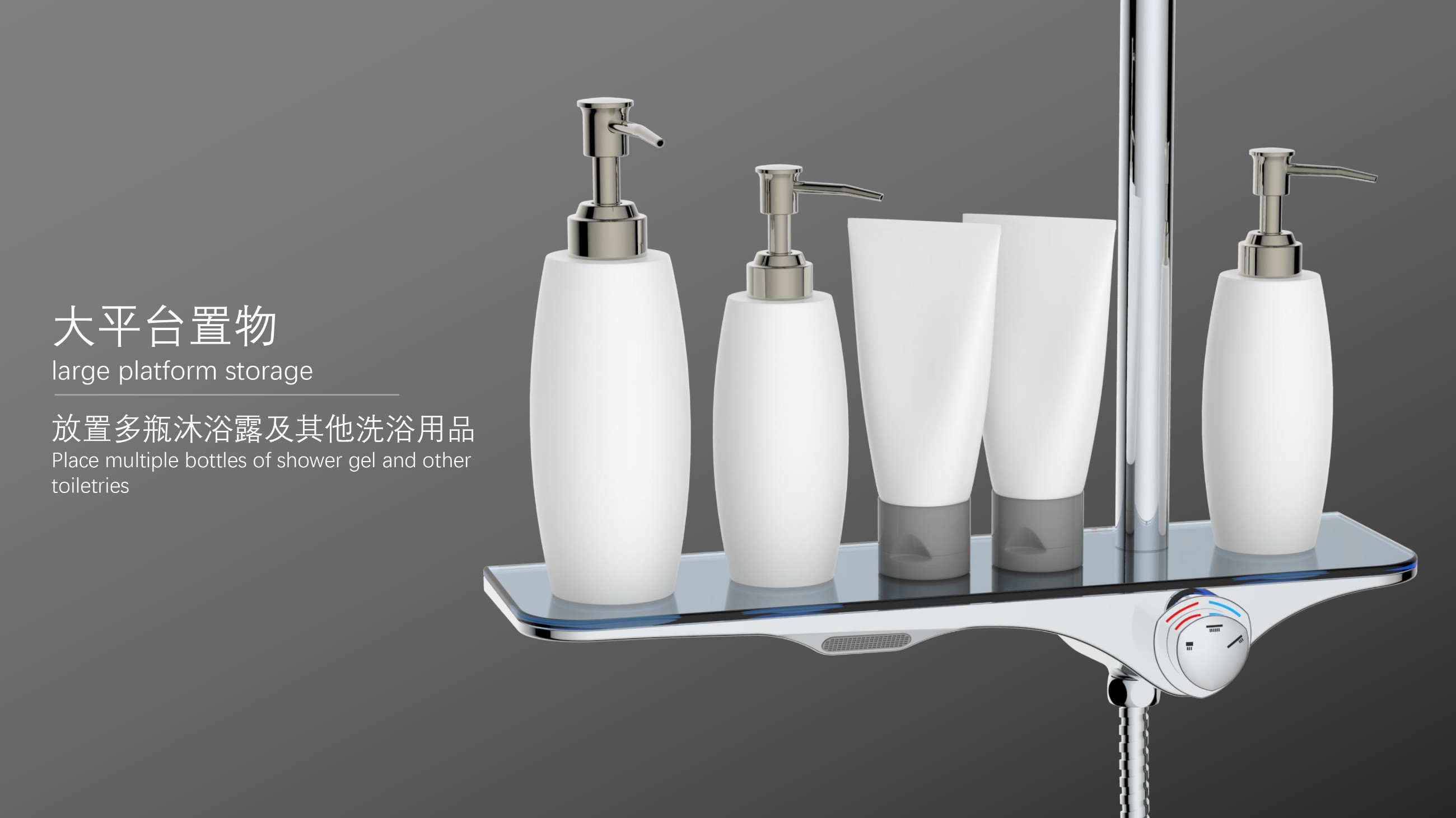 隱藏式下出水;仿山水大平臺置物;旋鈕切換三種模式出水